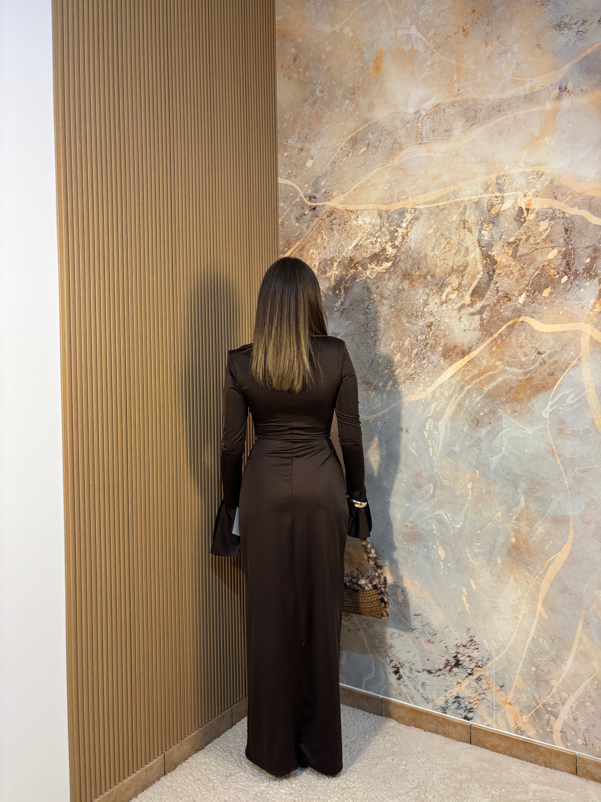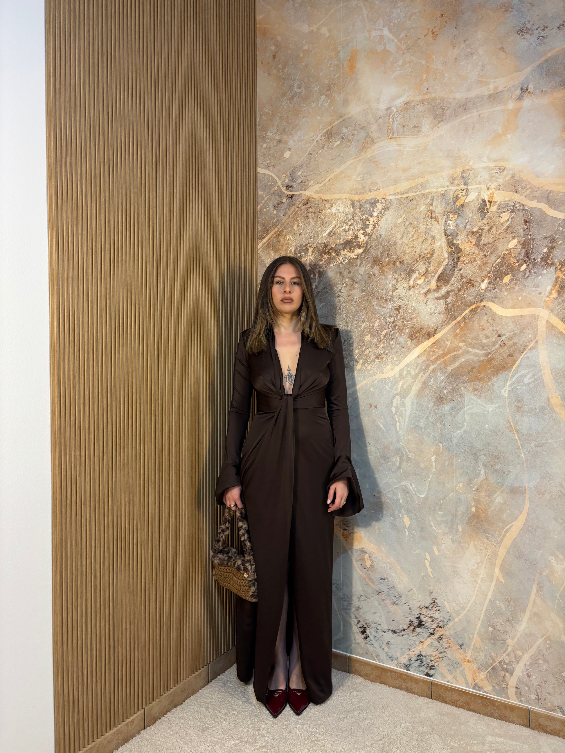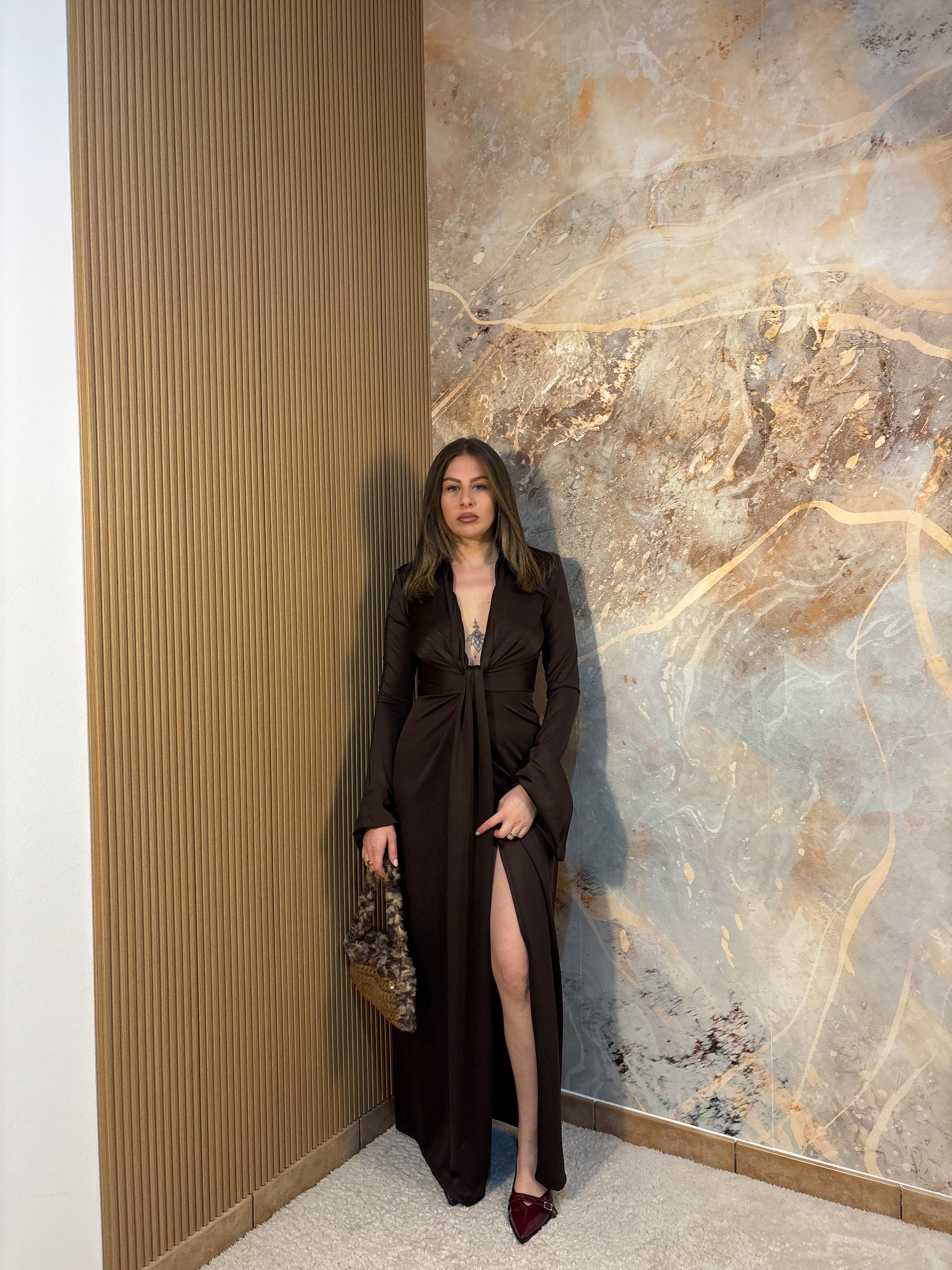 Abito lungo con scollo profondo, drappeggio e maniche a campana