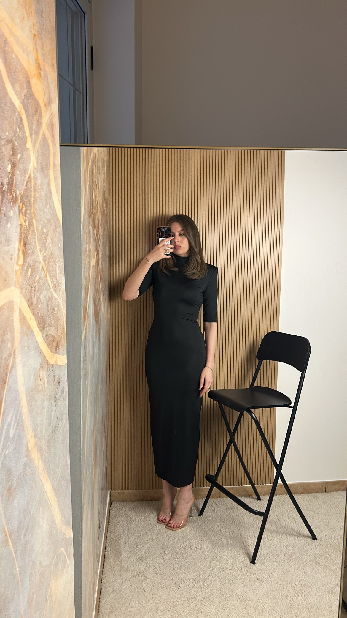 Abito midi con spalline imbottite e collo alto