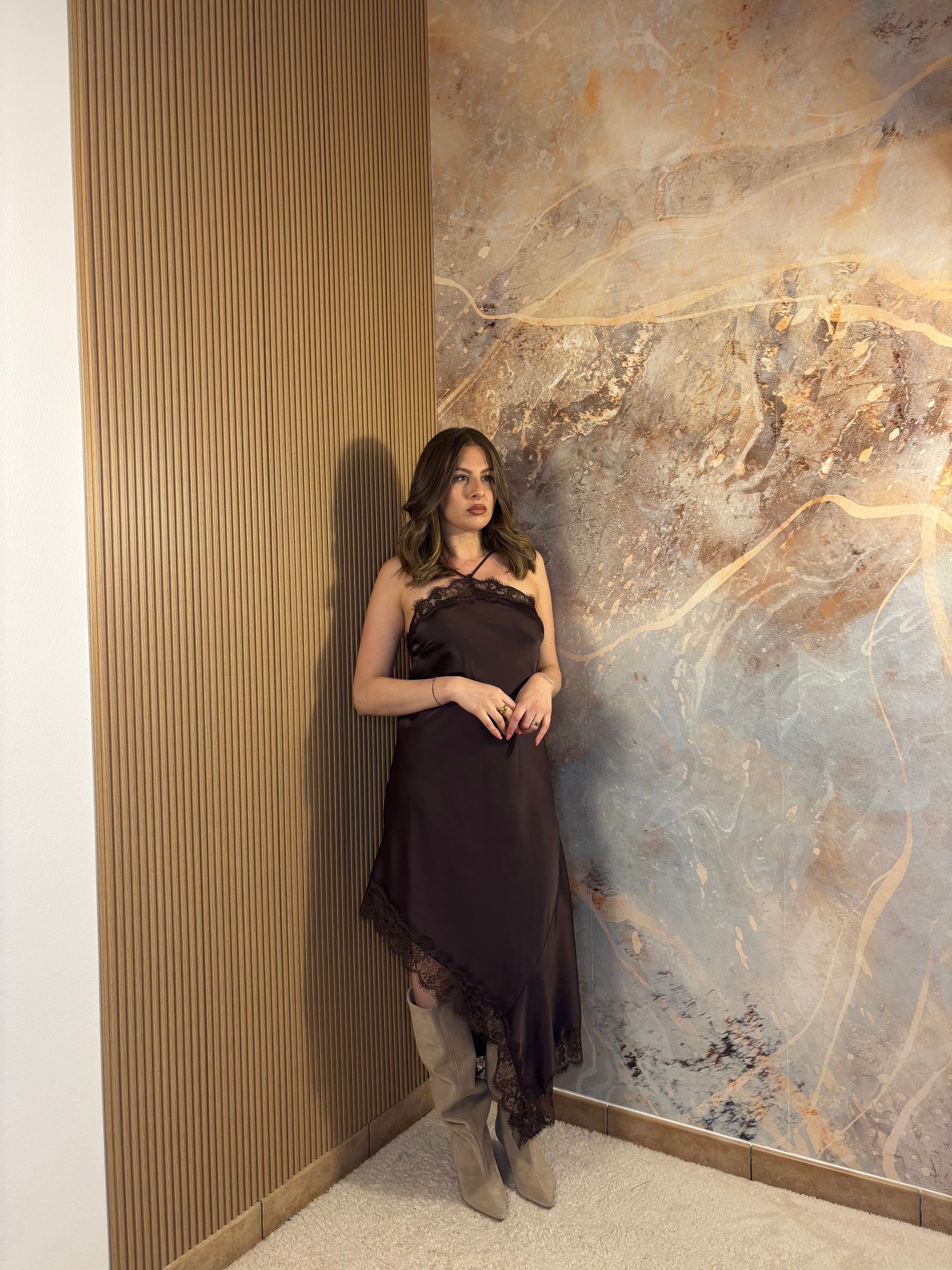 Abito in raso con inserti in pizzo e taglio asimmetrico