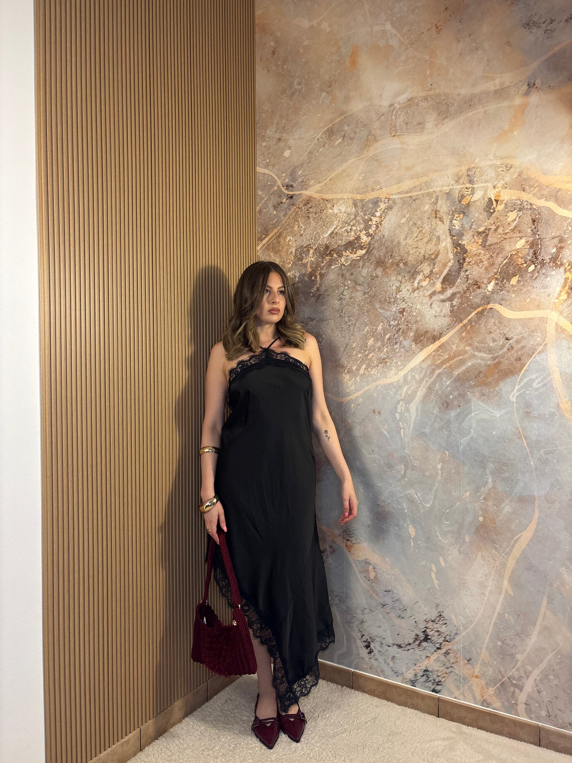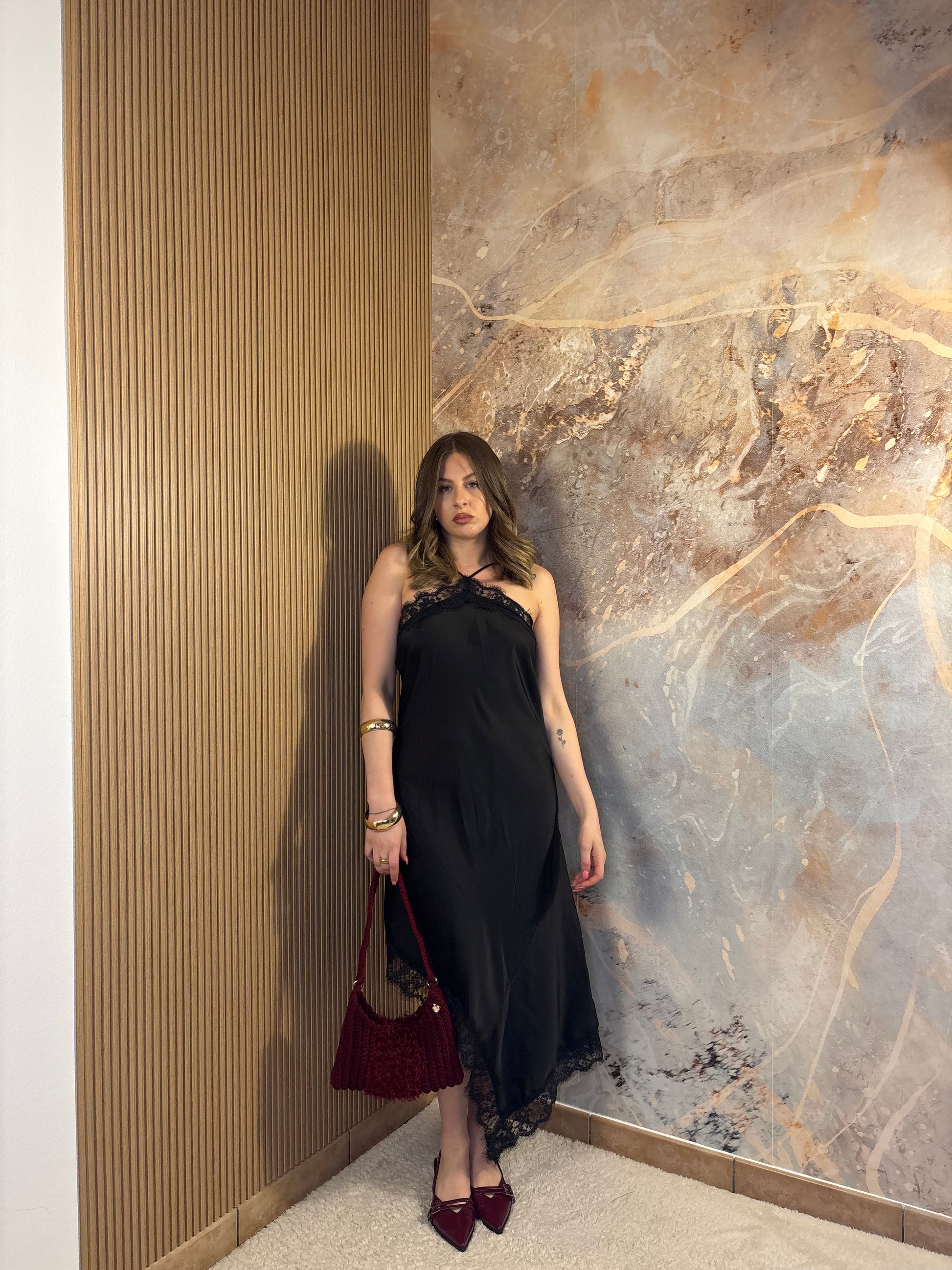 Abito in raso con inserti in pizzo e taglio asimmetrico