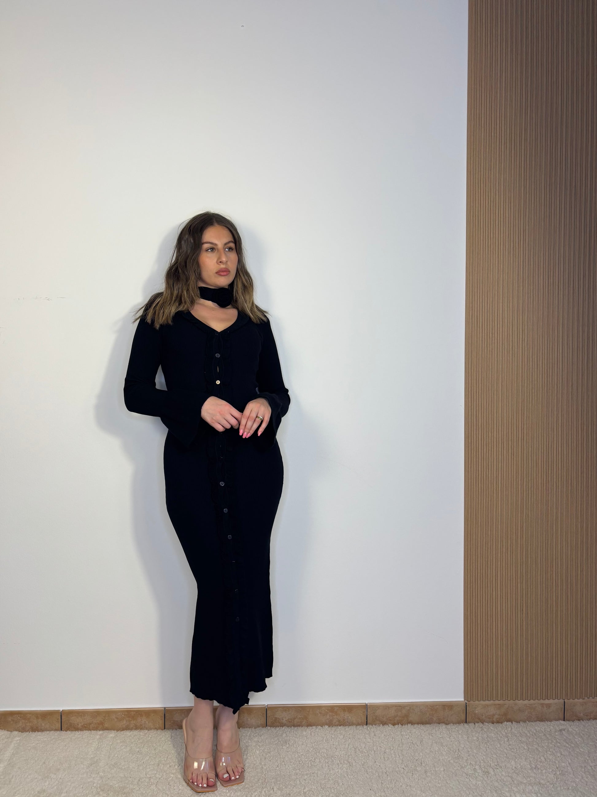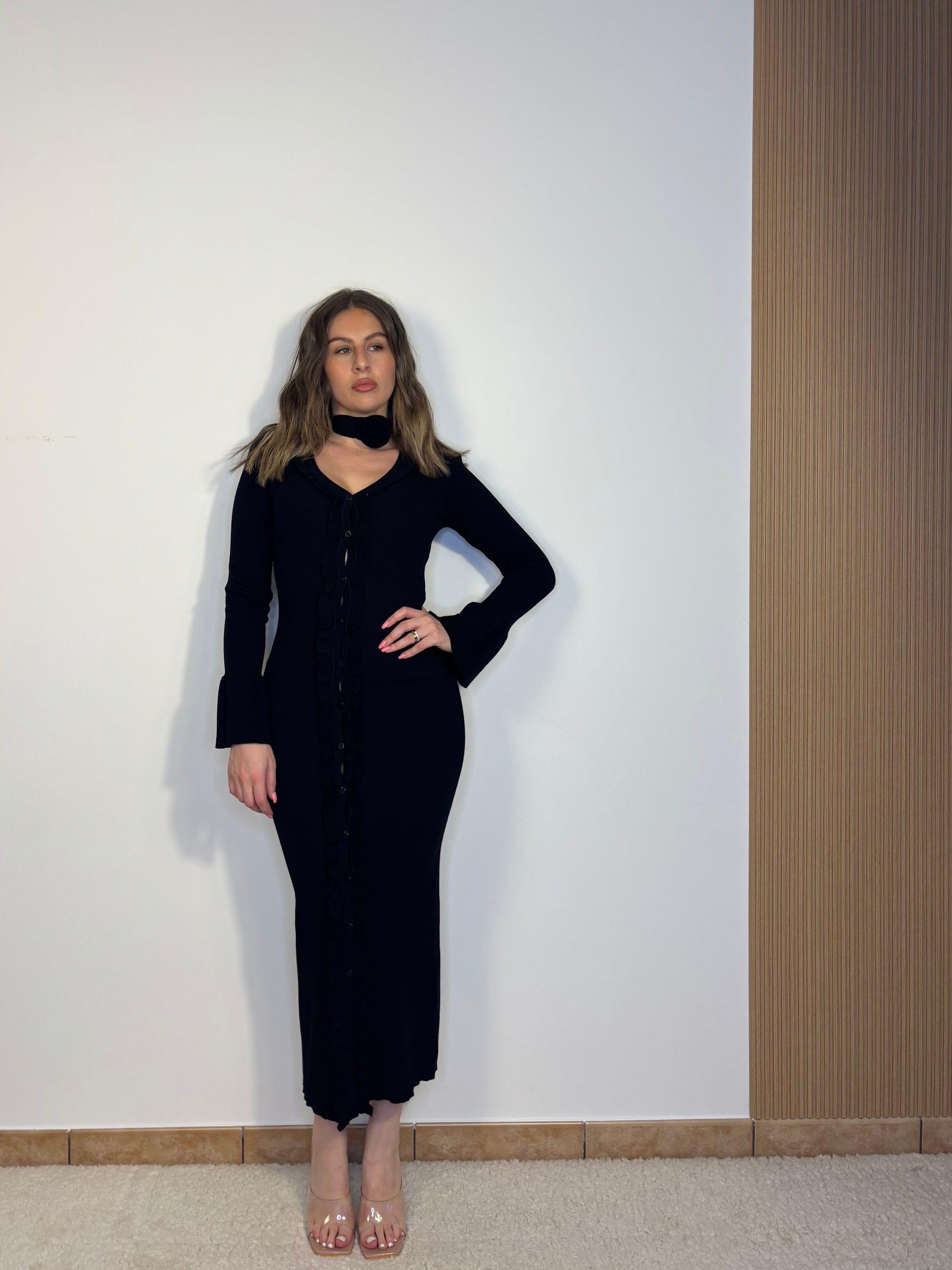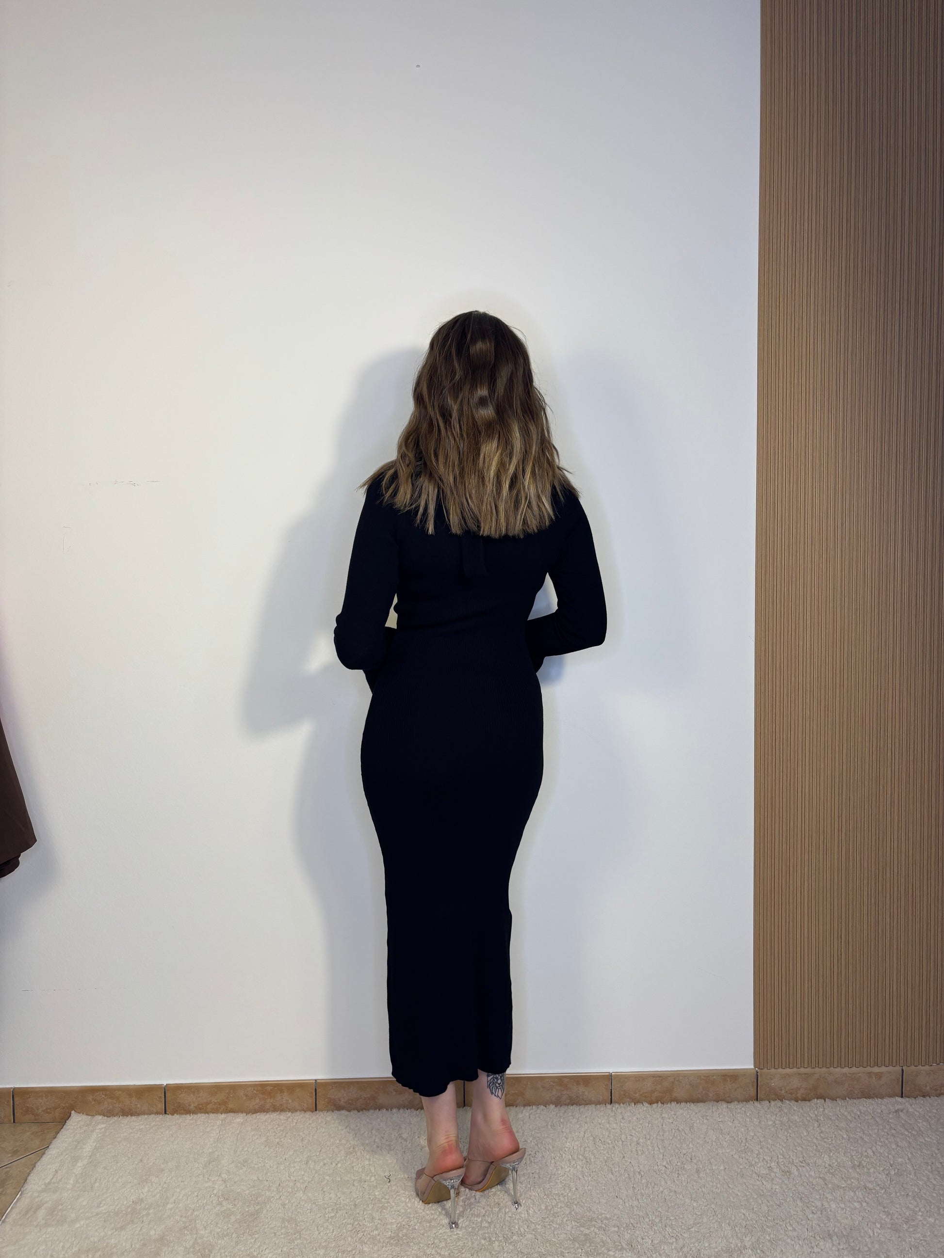 Vestito in maglia aderente a maniche lunghe con scollo a dettaglio e abbottonatura frontale. Un capo elegante e sofisticato, perfetto per look da sera o occasioni speciali.