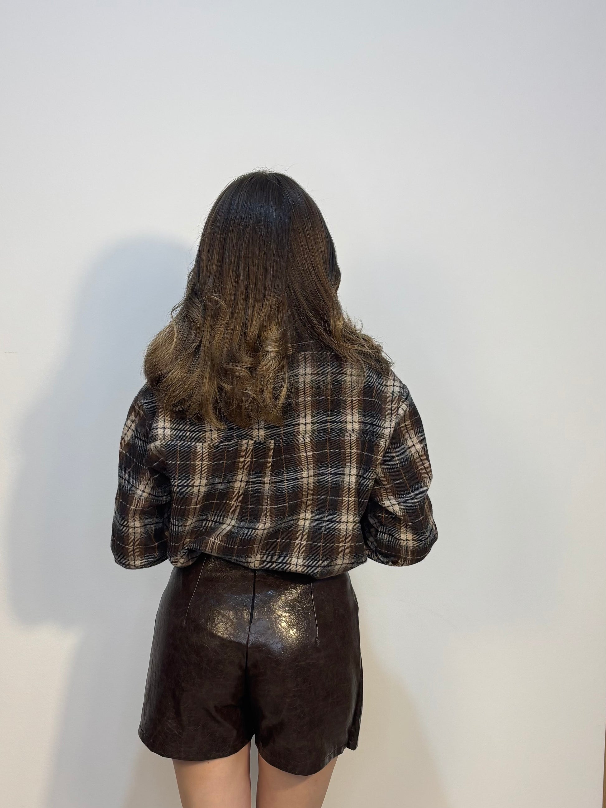 Camicia morbida a maniche lunghe con fantasia check marrone e blu, perfetta da indossare sia aperta che chiusa per un look casual.