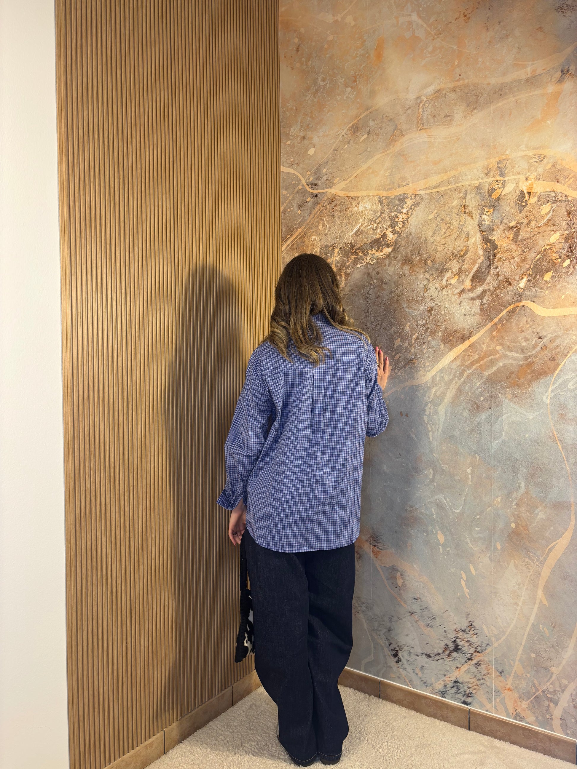Camicia blu a quadri micro, dal taglio over e dallo stile casual-chic. Versatile e moderna, perfetta da portare aperta o come capo protagonista per look street e disinvolti.