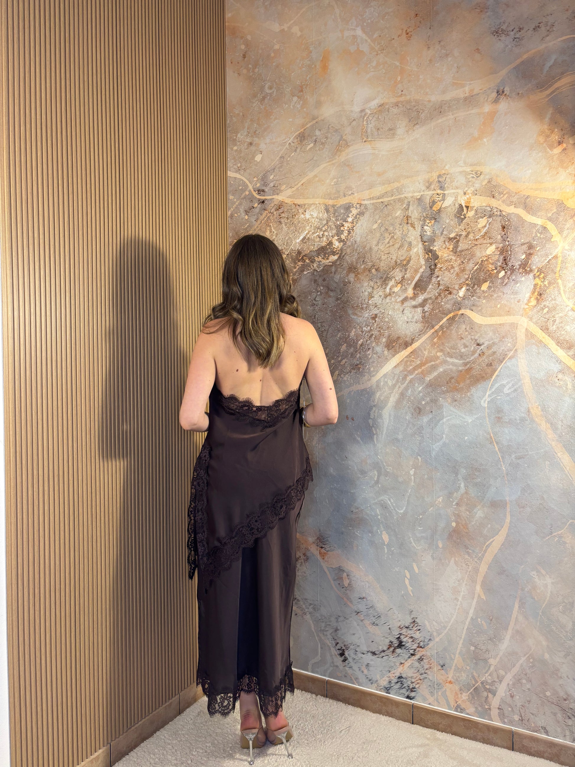 Coordinato in raso con inserti in pizzo, composto da gonna e top