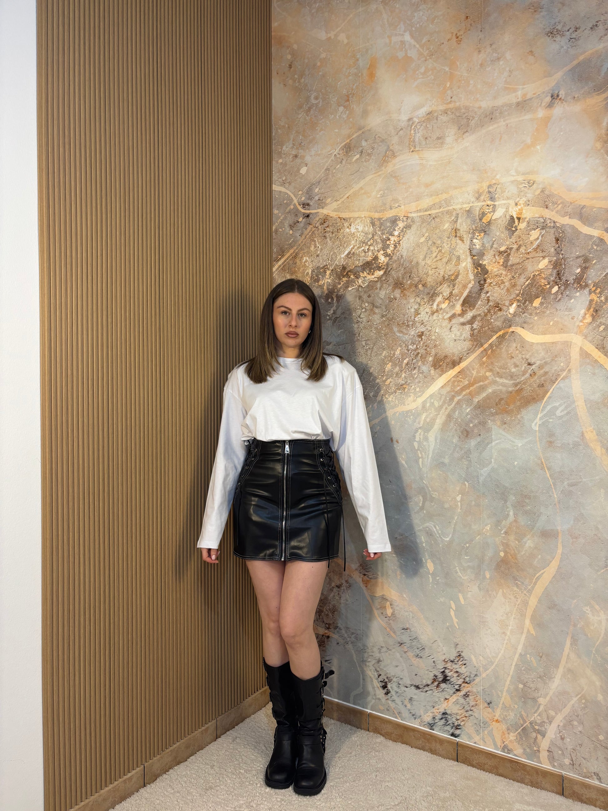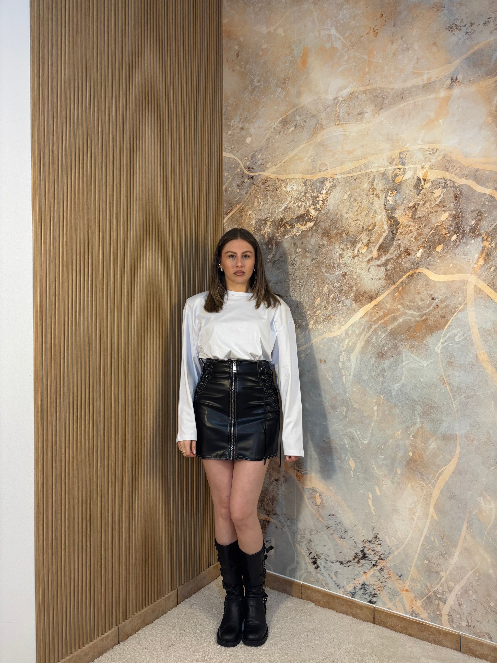 Gonna in pelle con cerniera e stringhe laterali