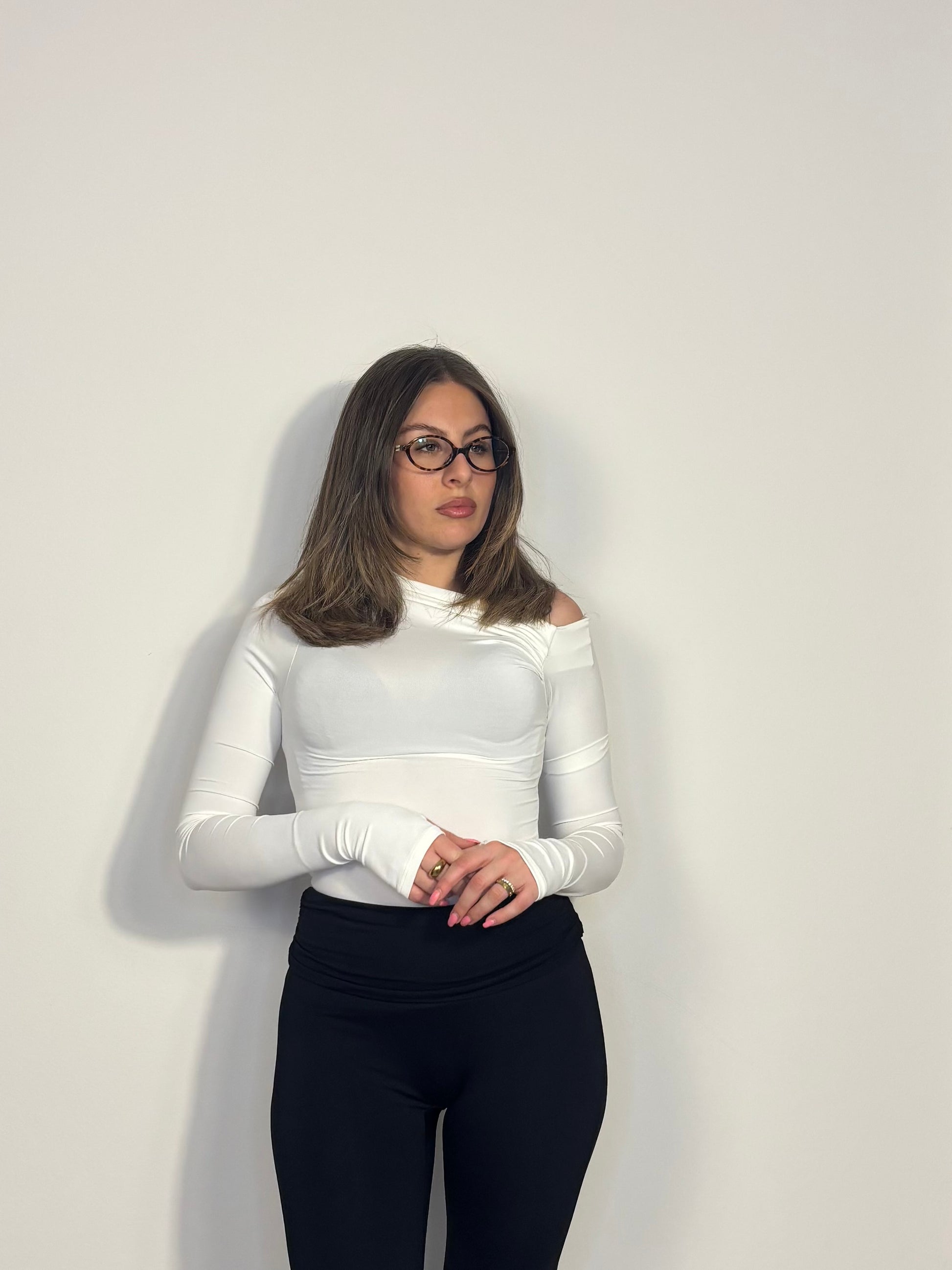Top aderente con dettagli cut-out sulla spalla, moderno ed elegante, ideale per look casual o serali.