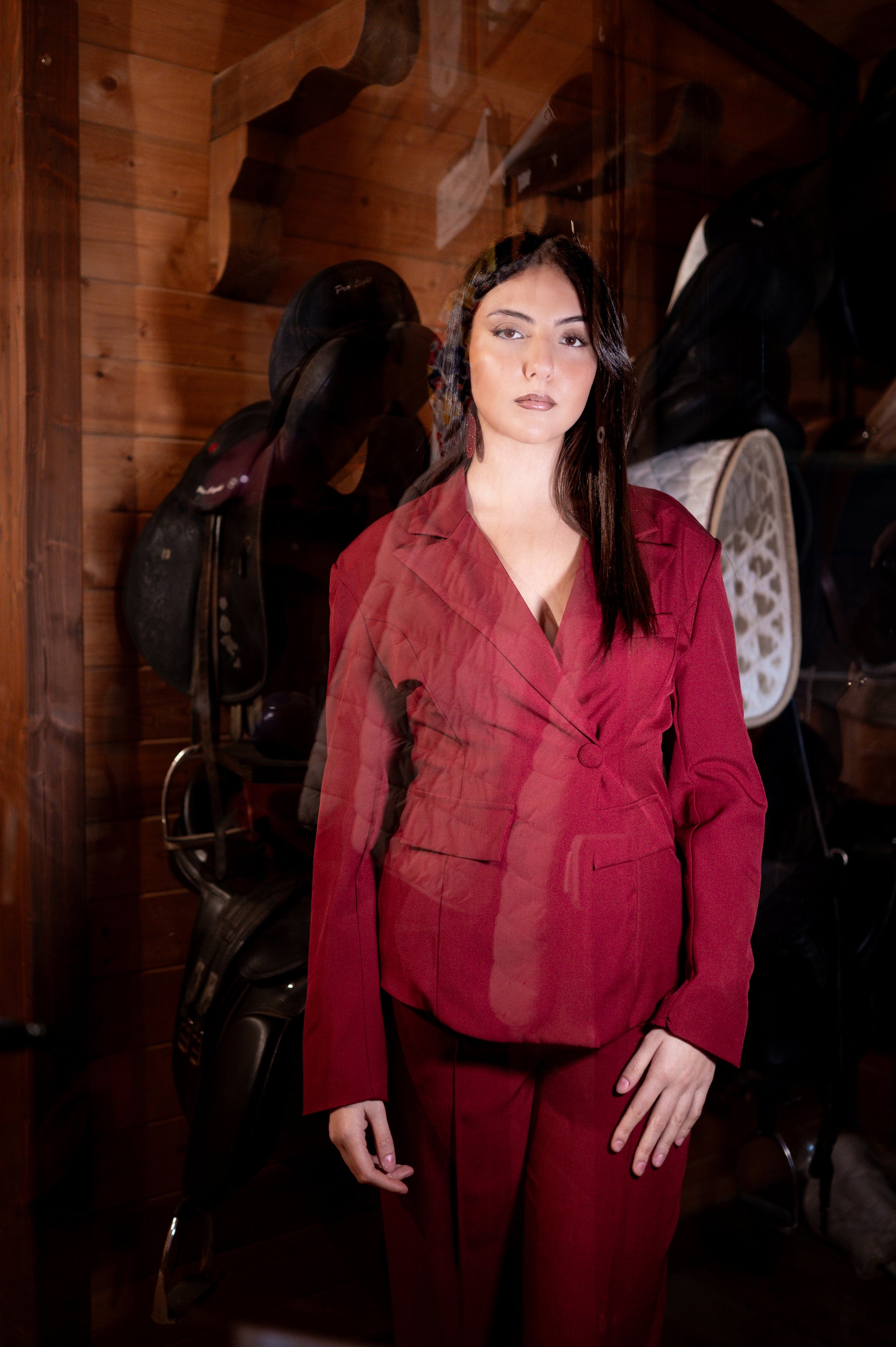 Tallieur composto da pantalone wide leg e giacca avvitata, colore rosso